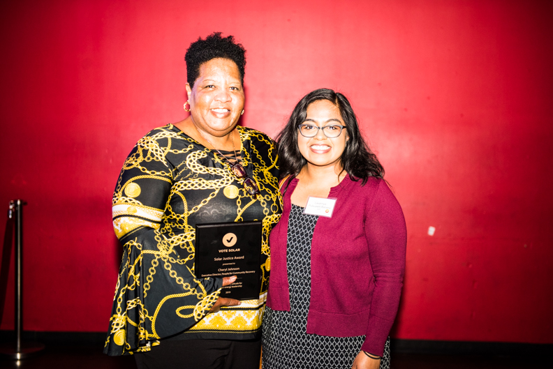 Cheryl Johnson, Executive Director of People for Community Recovery, accepted Vote Solar’s Dr. Espanola Jackson’s Solar Justice Award, which honors extraordinary leaders in environmental justice. People for Community Recovery was founded by Cheryl’s mother, Hazel Johnson, widely-recognized as the “Mother of Environmental Justice,” to fight environmental racism on Chicago’s heavily polluted southeast side.